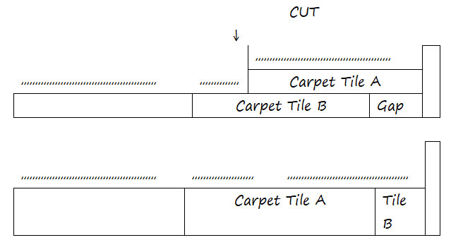 Fitter’s Tip -Be sure to lay each carpet tile exactly in line with its neighbour. If you allow the tiles to go “out of register” (i.e. where the corners of four tiles in a square don’t make a perfect cross) the effect can become compounded down the line of tiles.